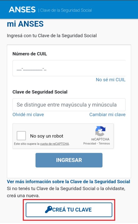 La solicitud se tramita a través de la Administración Nacional de la Seguridad Social (Anses). Para ello, hay que ingresar a Mi Anses en el sitio web del organismo (clic aquí), escribiendo tu CUIL y tu clave de seguridad social en los campos correspondientes. Seleccionarás luego «no soy un robot» para verificar y finalmente vas al botón «ingresar». Si aún no contas con la clave, podrás tramitarla online haciendo clic en «creá tu clave».