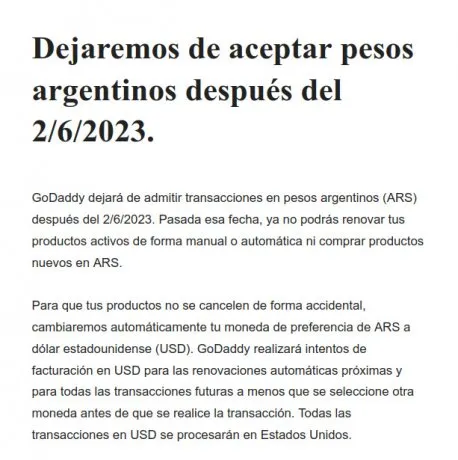 En el mail compartido a quienes utilizan el servicio, GoDaddy explicó que «dejará de admitir transacciones en pesos argentinos (ARS) después del 6/2/2023». Indicó que pasada esa fecha, los clientes «no podrán renovar sus productos activos de forma manual o automática ni comprar productos nuevos en pesos argentinos».