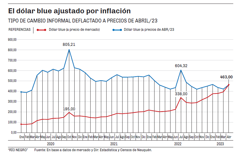 Para saber si el dólar blue puede seguir subiendo, y si dicha suba «tiene lógica», es mucho más valioso apreciar el momento en que la serie histórica encuentra cierta estabilidad en términos reales. Al respecto, resulta que entre julio de 2021 y enero de 2022, el dólar blue en términos reales (a precios de abril de 2023), promedió los $560. Asimismo, entre agosto de 2022 y enero de 2023, promedió los $460.