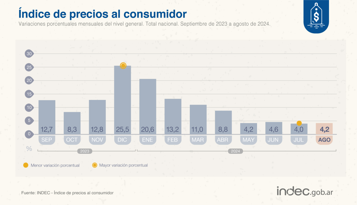 El Instituto Nacional de Estadística y Censos (Indec) dio a conocer este miércoles el Índice de Precios al Consumidor (IPC) de agosto. Según el informe mensual, la inflación fue del 4,2%. Los datos de Neuquén y Río Negro.