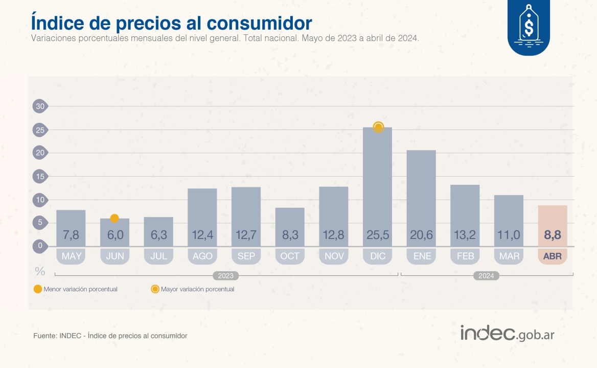 El Indec dio a conocer el dato de inflación del mes de abril, y se confirmaron los mejores pronósticos. En el cuarto mes del año, la inflación se ubicó en el 8,8%. El acumulado del primer cuatrimestre de 2024 es del 65% y el de los últimos doce meses llega al 289,4%. Se trata de una enorme noticia para el gobierno, que oxigena políticamente y confirma el rumbo.
