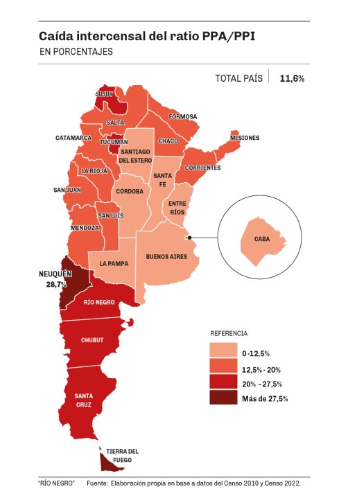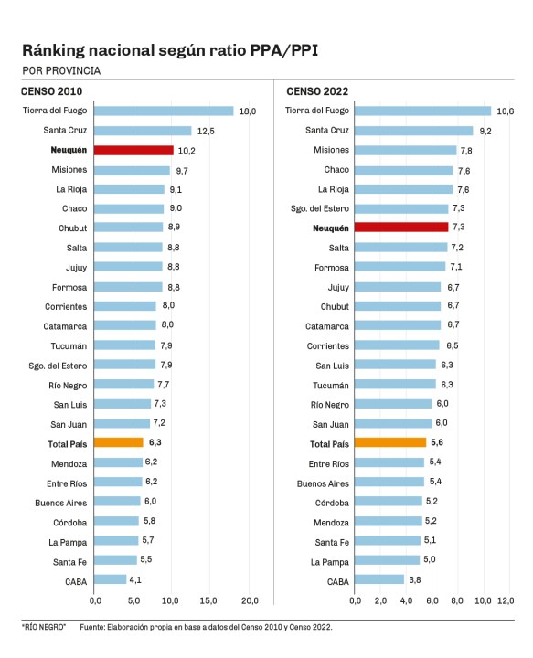 Neuquén fue, detrás de Tierra del Fuego, la provincia argentina cuya población más envejeció entre 2010 y 2022, según surge de los resultados del Censo Nacional de Población, Hogares y Viviendas del 2022 (Censo 2022) y del 2010 (Censo 2010). Como se aprecia en el mapa anterior, la disminución intercensal del ratio PPA/PPI fue del 28,7%, muy por encima del 11,6% de caída que se registró en el total del país.