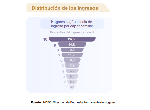 El informe de Indec es además un reflejo de la desigualdad. La estadística oficial muestra que el 10% de los hogares más ricos del país recibe el 24,5% de los ingresos totales, mientras que el 10% más pobre recibe el 3%. Si se ilustra con una torta dividida en 10 porciones para repartir entre 10 comensales, el comensal más rico de Argentina se come dos porciones y media, y el comensal más pobre solo recibe un tercio de porción.