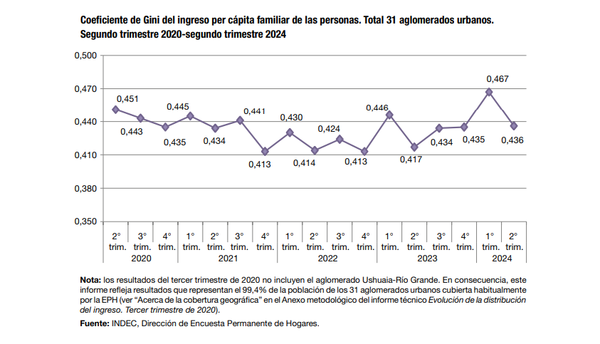 El registro para la primera mitad de 2024 es de 0,436. Si se compara con el registro de 0,467 en el primer trimestre del año cuando se produjo el mayor impacto del ajuste, se trata de una mejora. Sin embargo al comparar con la situación de hace exactamente un año cuando el Gini era de 0,417, se aprecia un deterioro ostensible en la distribución durante el primer semestre de 2024.