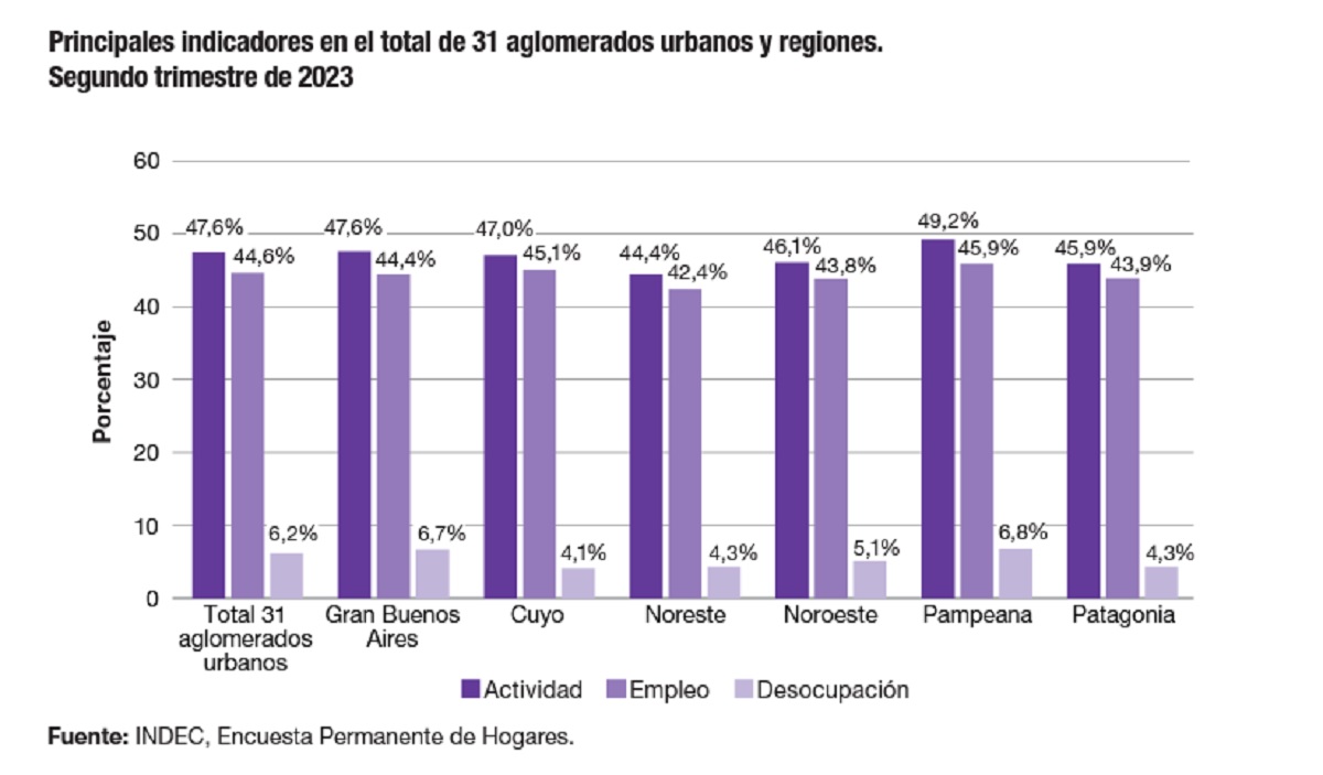 La tasa de desocupación o desempleo bajó al término del segundo trimestre de 2023 al 6,2%, contra el 6,9% de igual período del año pasado informó hoy el Instituto Nacional de Estadística y Censos (Indec)