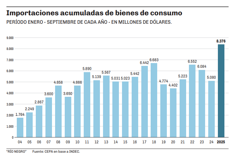 Si se considera el acumulado entre los meses de enero y septiembre del presente año, las importaciones de bienes de consumo ascienden a US$ 8.376 millones. Agregando el mes de octubre, el dato supera largamente los US$ 10.000 millones. Nunca desde la crisis de 2001 el volumen de importaciones de consumo tuvo semejante magnitud.