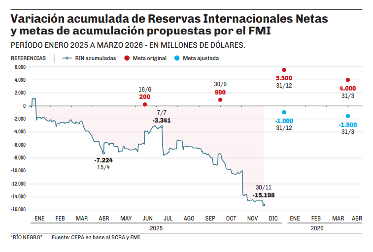 La metodología que utiliza el FMI para contabilizar la acumulación de reservas no toma en cuenta los desembolsos del organismo al país que recibe la asistencia. En base a ese criterio establecido en el Memorando Técnico de Entendimiento (TMU) firmado en abril, la variación acumulada de Reservas Internacionales Netas hasta el 30 de noviembre era de US$ -15.198 millones, mientras que la meta actualizada por el organismo en junio era de US$ -1.000.
