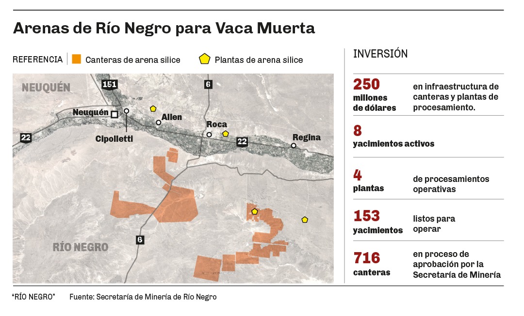 - Entre 2019 y 2020 se produjo la explosión de las canteras en Río Negro. Las arenas de cercanía se usaron cada vez más en Vaca Muerta. Los pedidos de explotación llegaron a 700 solicitudes.