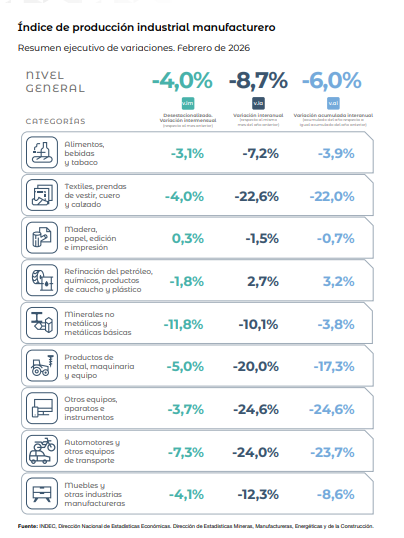La actividad industrial en la Argentina volvió a mostrar un fuerte retroceso en febrero. Según el último informe del INDEC, el Índice de Producción Industrial Manufacturero (IPI) registró una caída interanual del 8,7%, mientras que en la comparación mensual desestacionalizada descendió un 4%.