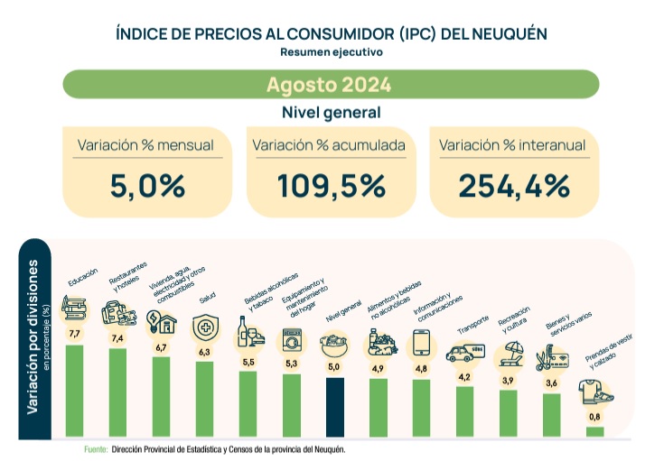 En cuanto a Neuquén, el dato de suba mensual fue del 5% y acumuló un incremento de 254,4% interanual. Según indicó Estadística y Censos, las divisiones que más escalaron fueron Educación (7,7%), Restaurantes y hoteles (7,4%), Vivienda, agua, electricidad y otros combustibles (6,7%) y Salud (6,3%).
