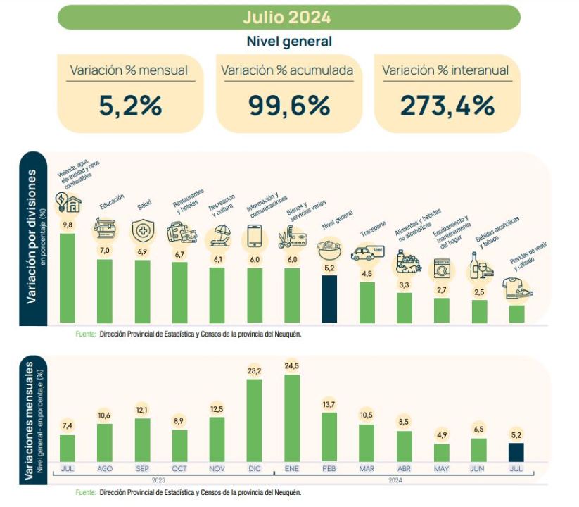 Volviendo a Neuquén, el dato de suba mensual fue del 5,2% y acumuló un incremento de 273,4% interanual. Según indicó Estadística y Censos, las divisiones que más variaron fueron Vivienda, agua, electricidad y otros combustibles (9,8%), Educación (7,0%), Salud (6,9%) y Restaurantes y hoteles (6,7%).