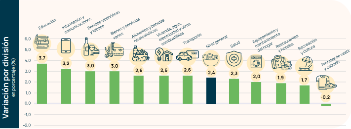 Las divisiones que más aumentaron fueron Educación (3,7%), Información y comunicaciones (3,2%), Bebidas alcohólicas y tabaco (3,0%), Bienes y Servicios varios (3%), Alimentos y bebidas no alcohólicas (2,6%), Vivienda, agua, electricidad y otros combustibles (2,6%), y Transporte (2,6%).