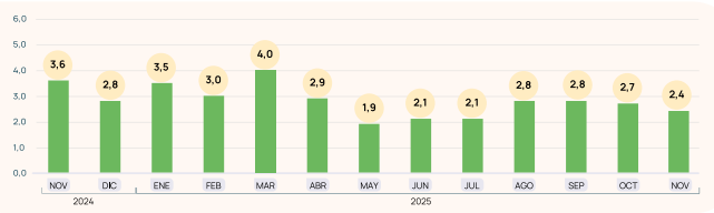 De esta manera, la variación de precios tuvo una merma, ya que la cifra de octubre fue del 2,7%, y anteriormente la de septiembre había sido del 2,8%.