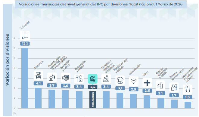 A nivel de rubros, Educación encabezó los aumentos con un salto del 12,1%, impulsado por el inicio del ciclo lectivo. Le siguieron Transporte con 4,1%, Vivienda, agua, electricidad y otros combustibles con 3,7%, y Restaurantes y hoteles junto con Recreación y cultura, ambos con subas del 3,4%, en línea con el promedio general.