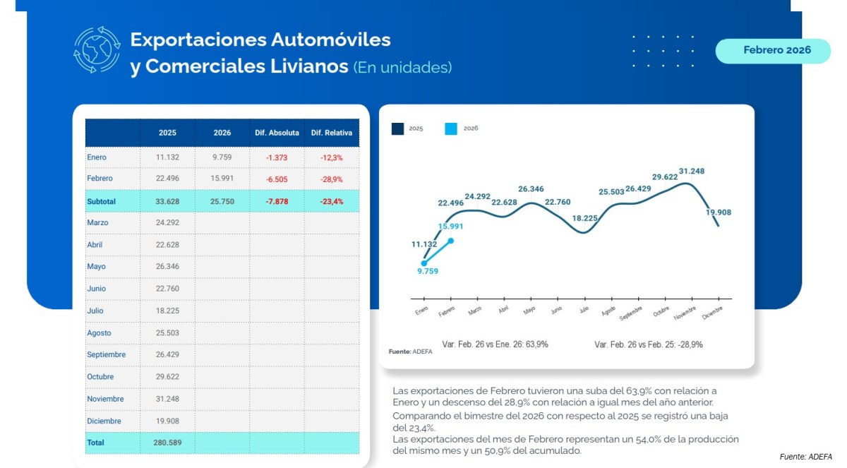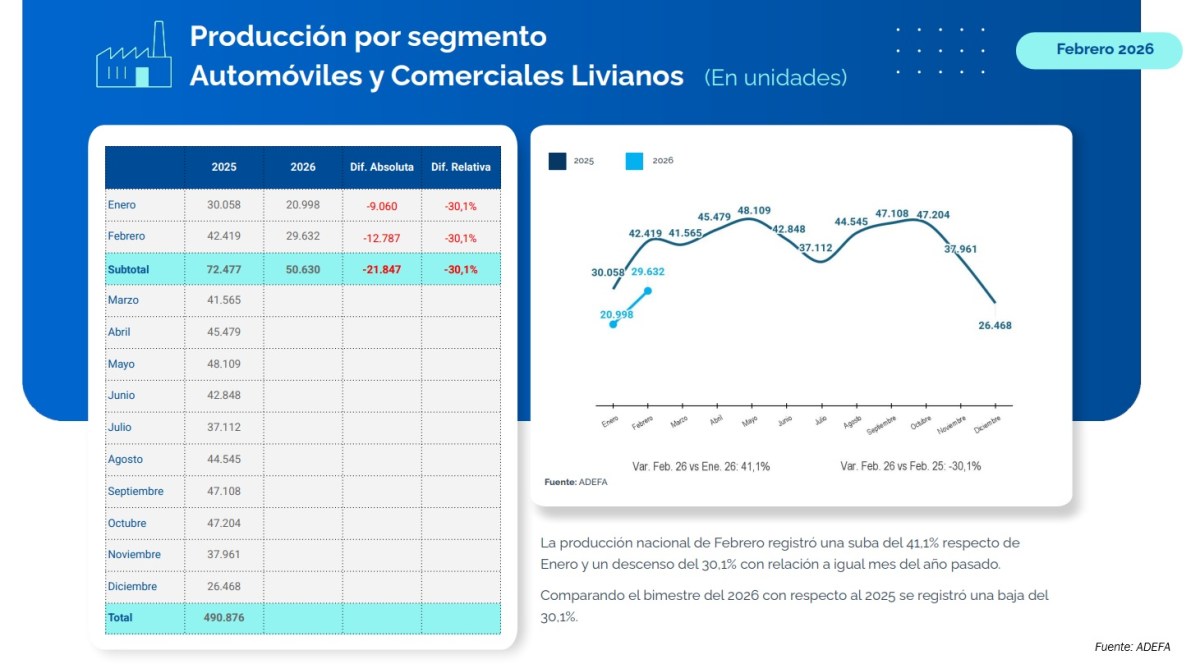 Asimismo, si se toma en cuenta el acumulado del 2026 (enero-febrero), se produjeron 50.630 unidades frente a las 72.477 de igual periodo del año anterior. En otras palabras, al inicio de 2026 la industria automotriz experimenta una profunda caída del 30% en relación al año anterior.