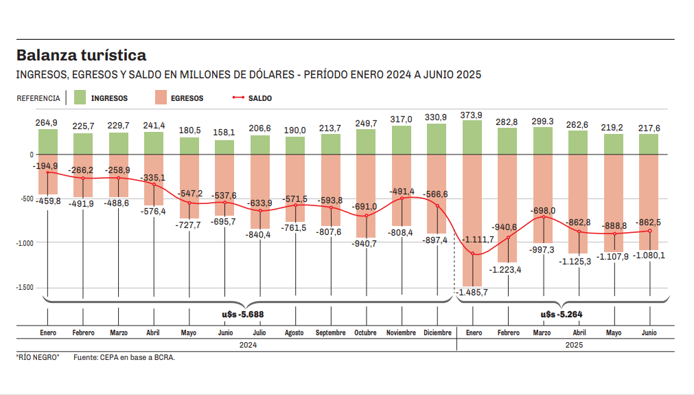 En el acumulado de los primeros seis meses del año, el turismo generó salida de divisas por US$ 5.264 millones. La suma es equivalente a los US$ 5.688 millones que salieron en total en los 12 meses del año pasado. Dicho de otra forma, en solo un semestre de 2025 se fue por turismo la misma cantidad de divisas que en todo el año 2024.