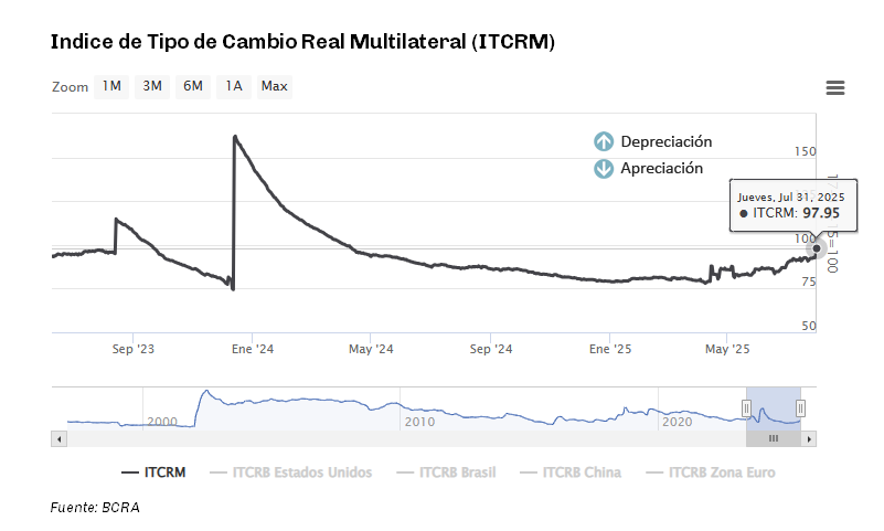 Tras la corrección cambiaria de estos días, el ITCRM registró 97,95 el último día de julio. Equivale a decir que pese a la suba de las últimas tres semanas, el atraso continúa.