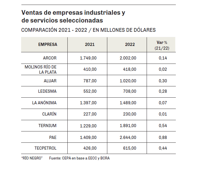 En relación a la rentabilidad, medida como “resultado operativo sobre ventas”, el citado informe revela que, tal como intuye Rubinstein, las cuatro principales empresas industriales (Arcor, Ledesma, Aluar y Molinos Río de la Plata), elevaron su rentabilidad promedio de 9,1% a 12,5% en la primera mitad de 2022.