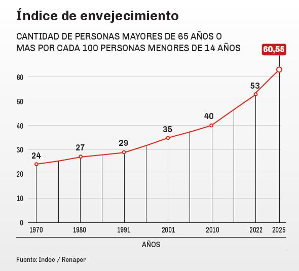 El índice de envejecimiento es un indicador que compara la cantidad de personas mayores de 65 años por cada 100 personas de 14 años o menos. En base a datos de Indec y Renaper, resulta que en 1991 existían 29 personas mayores de 65 años por cada 100 personas menores de 14 años, que esa relación se elevó hasta 35 en 2001, hasta 53 en 2022, y se estima en 60,55 en el año 2025.
