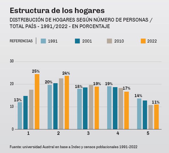 En base a los Censos Nacionales de Población, Hogares y Viviendas del Indec, el estudio señala un crecimiento sostenido de los hogares unipersonales, que representaban el 13% del total en 1991, que llegaban al 17% en 2010, y que ya ascendían al 25% en 2022. En el mismo sentido, los hogares compuestos por solo dos personas pasaron del 20% al 24% entre 1991 y 2022. Equivale a decir que casi la mitad de los hogares argentinos está compuesto a lo sumo por dos personas.