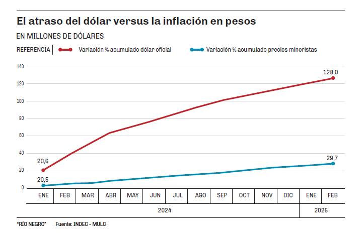 Si se toman como referencia los catorce meses comprendidos entre enero de 2024 y febrero de 2025, el Indice de Precios al Consumidor que publica el Indec, registra una inflación acumulada del 128%. En el mismo lapso, el tipo de cambio oficial avanzó apenas un 29,7%.