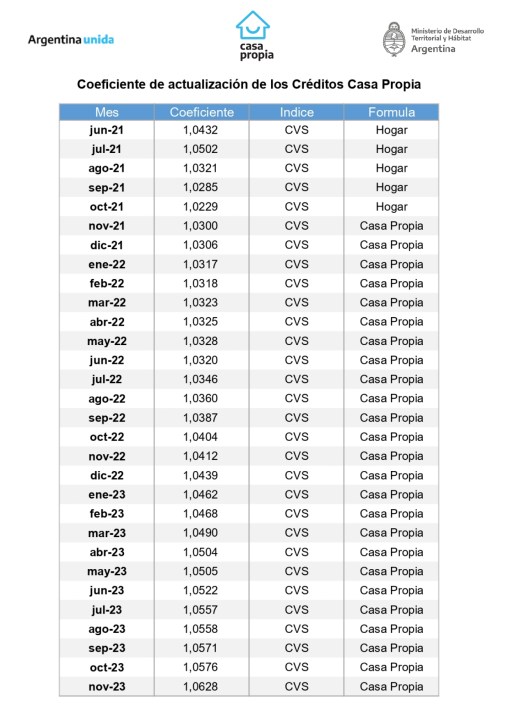 Transparencia: el cálculo se basa en información oficial pública y será comunicada en esta página web perteneciente al Ministerio de Desarrollo Territorial y Hábitat. Por su parte, el Coeficiente de Variación Salarial surge de información brindada por INDEC mientras que el Coeficiente de Estabilización de Referencia (CER) es publicado por el Banco Central de la República Argentina (BCRA).