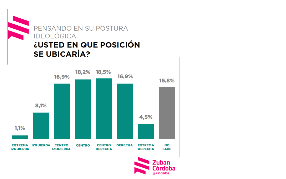 Una encuesta publicada por la consultora Zuban Córdoba & Asociados indaga acerca del posicionamiento ideológico de las mayorías en Argentina. Un primer resultado es elocuente: el 40% de los argentinos se autopercibe «de derecha». Como contracara, solo el 26,1% se manifiesta «de izquierda», y el 18,2% como «de centro».