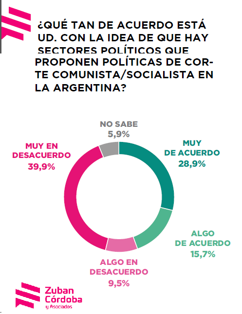 Un último aspecto en el que indaga el estudio, es respecto a la idea de que «ciertos sectores políticos argentinos proponen políticas de corte comunista/socialista». El resultado no deja de sorprender: un 44,6% de los encuestados cree que una parte de los políticos argentinos busca instalar el comunismo en el país.