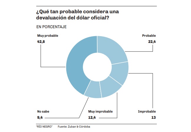 Otra imagen simbólica de las expectativas, gira en torno al levantamiento del cepo y la posibilidad de una nueva devaluación del tipo de cambio oficial. El estudio de Zuban & Córdoba registra que dos de cada tres personas evalúa como “probable” o “muy probable” que finalmente el gobierno vuelva a devaluar, lo que traería como corolario la interrupción del sendero a la baja de la inflación.