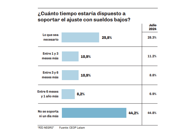 Las respuestas sorprenden. Un 25,8% indica que está dispuesto a soportar todo lo que sea necesario. En el medio se advierte un 30% que empieza a ponerle fecha de vencimiento al crédito que tiene el gobierno para que el resultado del ajuste sea evidente. En el otro extremo, un 44,2% dice que ya no aguanta ni un día mas (ver gráfico).