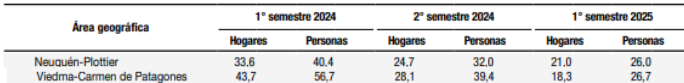 En la provincia neuquina, el conglomerado relevado fue Neuquén-Plottier: en cuanto a los hogares, la cantidad que quedaron bajo la línea de la pobreza fue el 21%; mientras que el relevamiento en personas dio 26%.