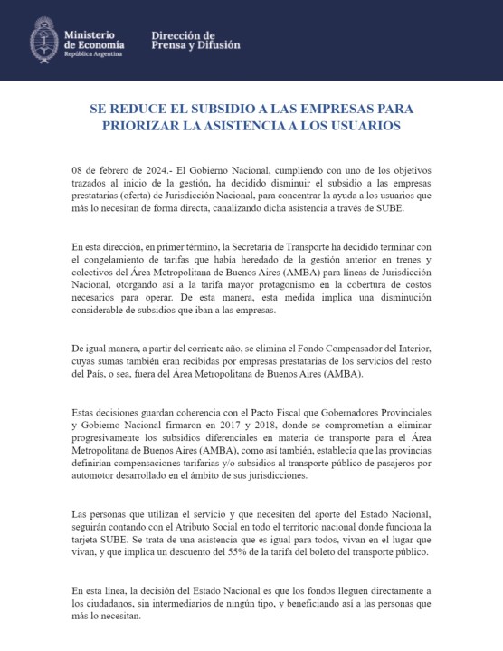 Como parte de una dura respuesta, el gobierno de Milei decidió quitar los subsidios a las empresas prestadoras del servicio de transporte de pasajeros de jurisdicción nacional. La medida está fundamentada en «concentrar la ayuda directamente a los usuarios que más lo necesitan», aplicando esta política a través del Sistema Único de Boleto Electrónico (SUBE), según informó la Secretaría de Transporte.