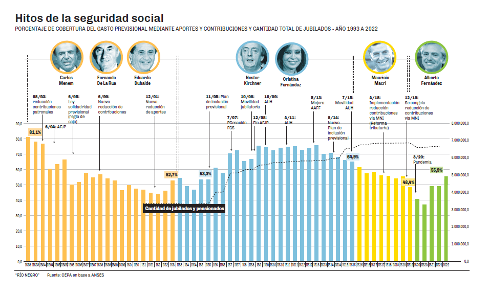Lo primero que salta a la vista, es que el sistema previsional argentino contaba con una cobertura financiera propia del 81,1% en el año 1992. El ratio se redujo durante toda la década menemista hasta llegar al piso del 44% a fines de 2001.