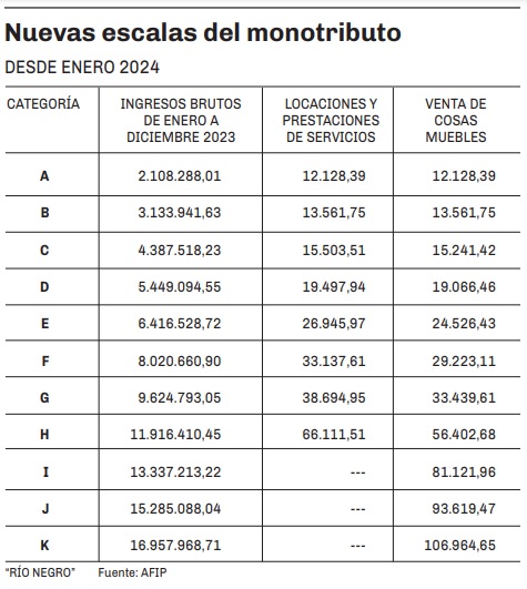Adjuntamos a continuación la tabla publicada por AFIP, la cual muestra cómo se ajusta el esquema de categorías para quienes deban abonar el monto íntegro de la cuota.