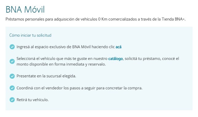 Los interesados podrán ingresar a la tienda BNA+ para conocer aquellos modelos que están disponibles para la venta y solicitar el préstamo en forma online. Los solicitantes recibirán una respuesta inmediata del monto del crédito disponible y podrán reservar su unidad desde la Tienda.