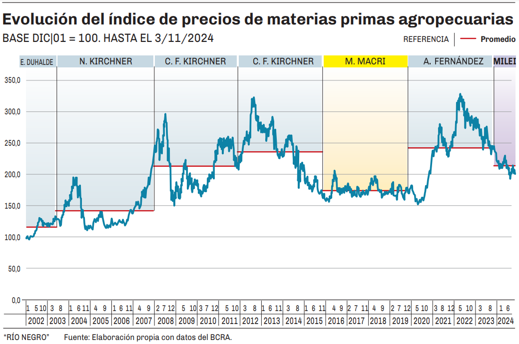 El Banco Central de la República Argentina (BCRA) elabora el índice de precios de las materias primas (IPMP), que refleja la evolución de los precios de las exportaciones de materias primas de nuestro país. El mismo muestra que, en promedio, la cotización promedio de los 12 commodities que más ponderan en nuestra balanza comercial se redujo un 7,6% en lo que va del gobierno de Milei, comparado con el promedio del gobierno de Alberto Fernández.