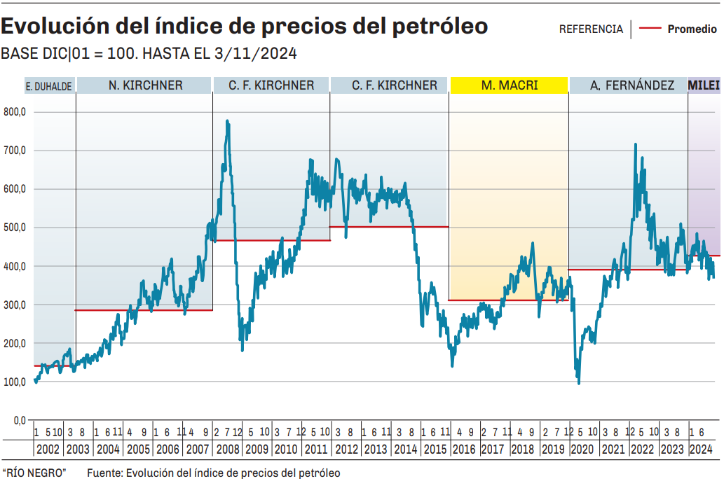 En promedio, en los 11 meses de gestión de Milei, el precio internacional de petróleo crudo es un 8,2% mayor que el promedio durante el gobierno de Alberto Fernández. En los cuatro años de aquel mandato, la cotización pasó por un piso al inicio de la pandemia y por precios muy elevados debido a la invasión rusa a Ucrania.