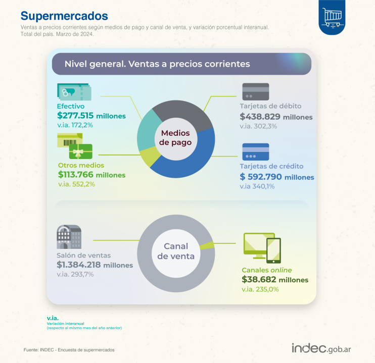 Por su parte, las efectuadas mediante tarjeta de débito sumaron 438.828.675 miles de pesos, lo que representa el 30,8% de las ventas totales y una variación positiva de 302,3% respecto al mismo mes del año anterior. Las ventas a precios corrientes abonadas con tarjeta de crédito sumaron un total de 592.789.832 miles de pesos, lo que representa el 41,7% de las ventas totales y una variación porcentual respecto a marzo de 2023 de 340,1%.