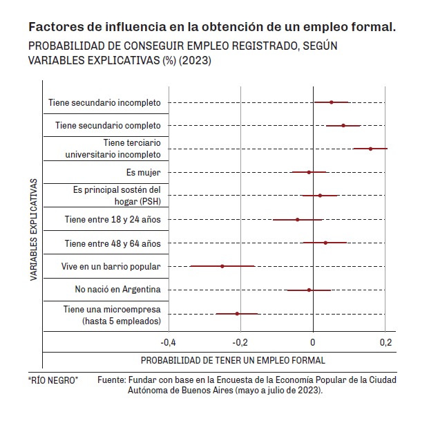 En base a los datos oficiales de CABA, el estudio señala que quienes tienen ‘secundario terminado’ o incluso el nivel ‘terciario / universitario incompleto’ obtienen mayores chances de formalidad laboral respecto al resto de quienes se desempeñan en la economía popular (ver infograma). Sin embargo, solo un 3% de los beneficiarios del Plan Potenciar ofrecen como contraprestación algún tipo de terminalidad educativa.
