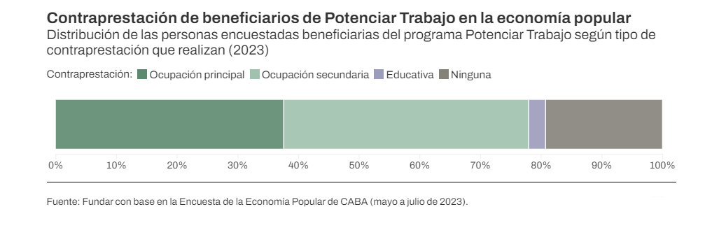 El informe de Fundar especifica que tales prestaciones laborales se enmarcan principalmente en sectores como servicios personales (en su mayoría, en servicios de limpieza y cocina), recuperación y reciclado (como recolectores de residuos o en trabajos de limpieza en espacios públicos) y en servicios socio comunitarios (sobre todo en comedores).