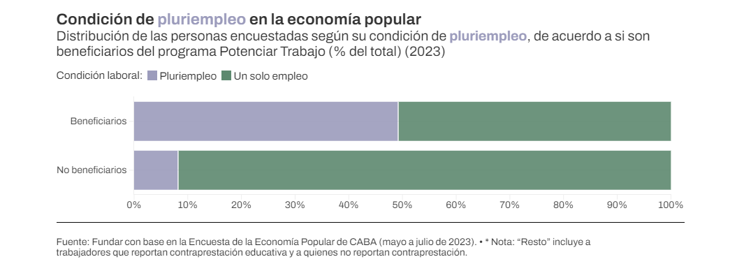 Por último, otro de los mitos más comunes en relación a los beneficiarios, es que “con un plan les alcanza para vivir”. En base a datos oficiales de CABA, el informe de Fundar establece que la mitad más uno de los beneficiarios de Potenciar Trabajo (50,8%), tiene más de una ocupación. Eso significa que el programa de asistencia es en realidad un complemento de ingresos para personas que reciben una baja remuneración por sus empleos.