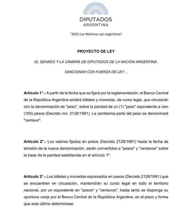 “A partir de la fecha que se fijará por reglamentación, el Banco Central de la República Argentina emitirá billetes y monedas, de curso legal, que circularán con la denominación de ‘peso’, sobre la paridad de un (1) peso equivalente a cien (100) pesos (Decreto 2128/1991). La centésima parte del peso se denominará ‘centavo’”, estipula el Artículo 1 del proyecto de ley presentado por Milman.