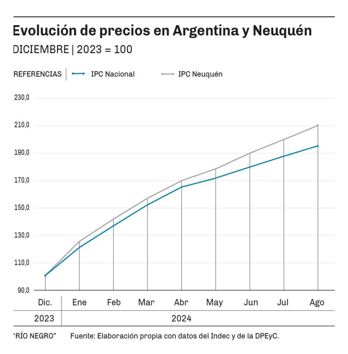 La comparación entre la evolución del IPC nacional y el IPC de la provincia de Neuquén arroja resultados llamativos, pero lógicos. Este último es elaborado por la Dirección Provincial de Estadística y Censos (DPEyC).
