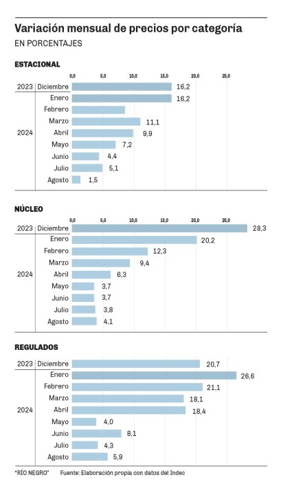 En julio, el congelamiento de tarifas energéticas había compensado el fuerte aumento de los precios estacionales. En agosto, la desaceleración de los precios estacionales compensó la recomposición tarifaria. Sin embargo, en ambos meses los precios de los bienes y servicios ubicados fuera de esas categorías se han acelerado.