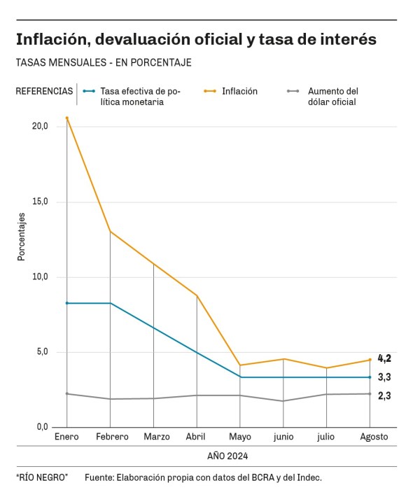 La apuesta en septiembre es el traslado a precios de la baja del impuesto PAIS, en lo que parece un nuevo reconocimiento del carácter multidimensional de la inflación. Sin embargo, para ver los efectos de la profundización de la contracción monetaria (fase de “emisión cero”) habrá que esperar al menos un año: el propio presidente avisó este mes que “la política monetaria tiene un rezago de 18 a 24 meses”.