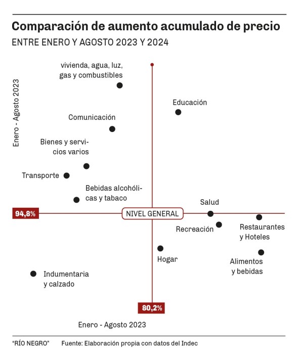 El más reciente tuvo lugar en diciembre, lo que ciertamente marcó un antes y un después en los precios relativos de la economía. En el gráfico adjunto hacemos una comparación entre 2024 y 2023 de los aumentos acumulados de precios por categorías durante el período enero-agosto.