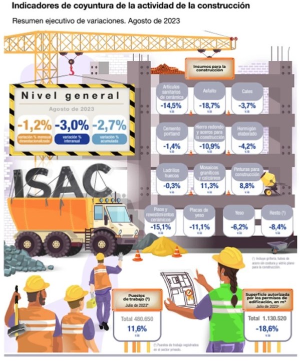 En agosto de 2023 el indicador sintético de la actividad de la construcción (ISAC) muestra una caída de 3,0% respecto a igual mes de 2022.