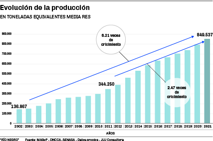 Otro de los números clave que muestra la fortaleza del sistema es la evolución que han mostrado los distintos tipos de carnes frescas en el mercado argentino. En 2002 de los poco más de 93 kilos per cápita que se consumían en el país, la carne vacuna concentraba el 72% del total de ese mercado, el pollo el 22% y la carne de cerdo solo el 6%. Con los cierres oficiales del año pasado, el consumo alcanzó un total de 109 kilos reflejando una participación del 44% la carne vacuna, 41% la de aves y 15% se llevó el cerdo. El salto relativo de esté último producto casi se multiplicó por tres.