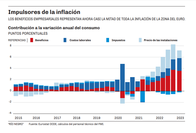El gráfico en cuestión refiere al continente europeo y acompaña esta nota. Allí se observa con claridad que en los dos años posteriores a la pandemia creció de manera sostenida la incidencia de los beneficios empresarios en el incremento de precios. Para 2023, los mismos representan más de la mitad de la inflación total en el viejo continente.