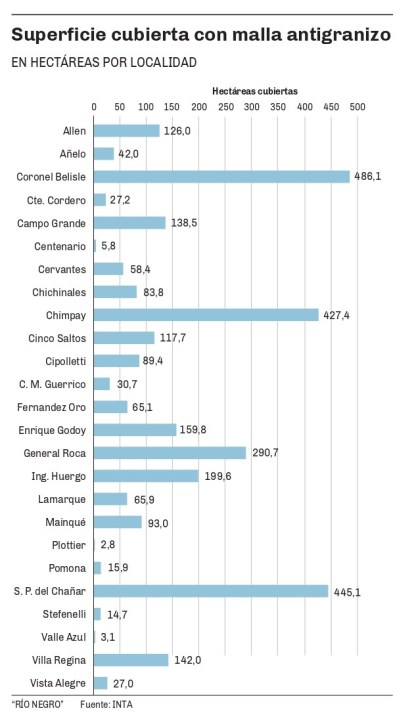 El INTA difundió esta semana un informe actualizado sobre la superficie cubierta con malla doble propósito en el norte de la Patagonia y allí se revela que sólo 3.157,55 hectáreas están a resguardo del granizo con ese sistema.